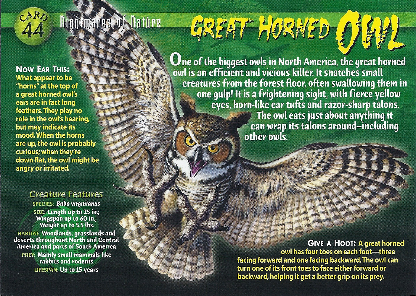 The second largest owl in north america this massive raptor is capable of making a meal out of animals larger than itself. How much does a great horned owl weigh. Great horned owl talons diameter size color force. Great horned owl eyes how far can a great horned owl see.